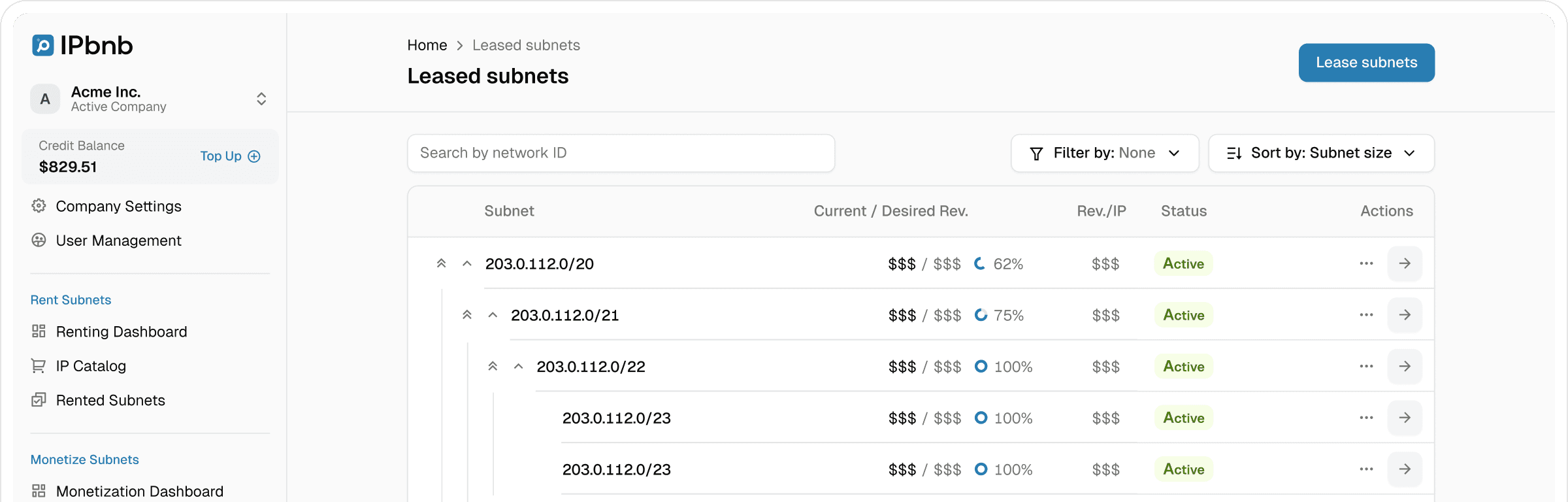 Lease income is driven by block size (typically /24 and larger), range reputation, RIR region, geolocation fit, and term length. Operational factors matter too: how quickly a block can be routed, and how strict the usage profile must be. IPbnb prices to market and focuses on healthy occupancy while protecting long-term range value.