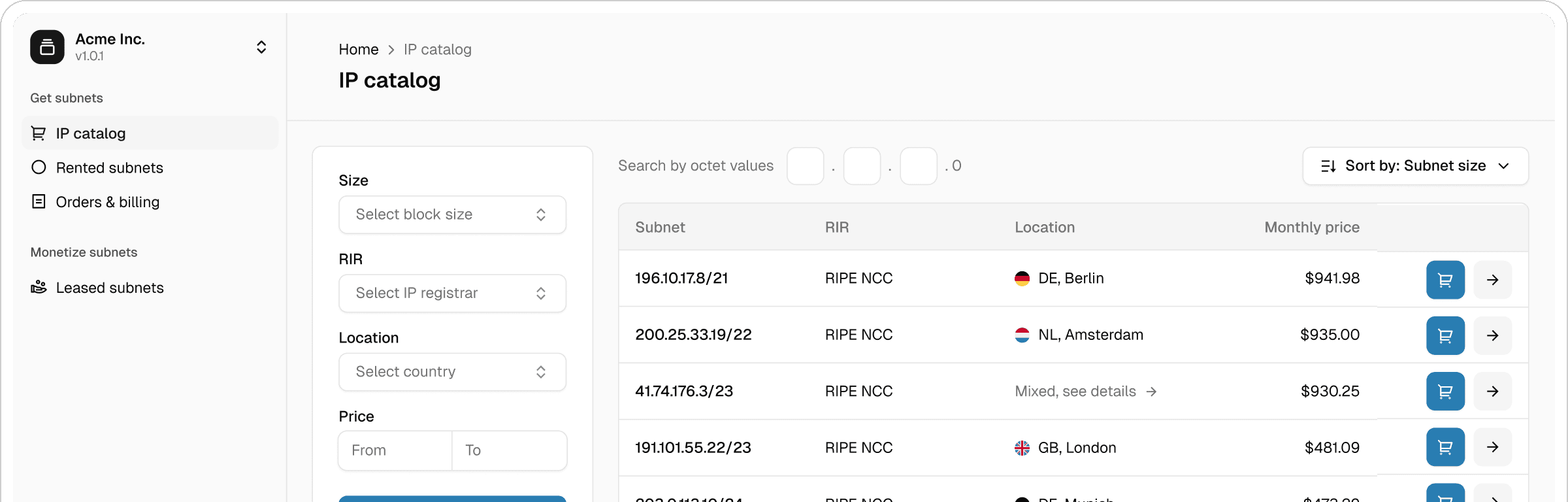 Rent IPv4 blocks fast, monetize unused space, or build a managed IPv4 portfolio.